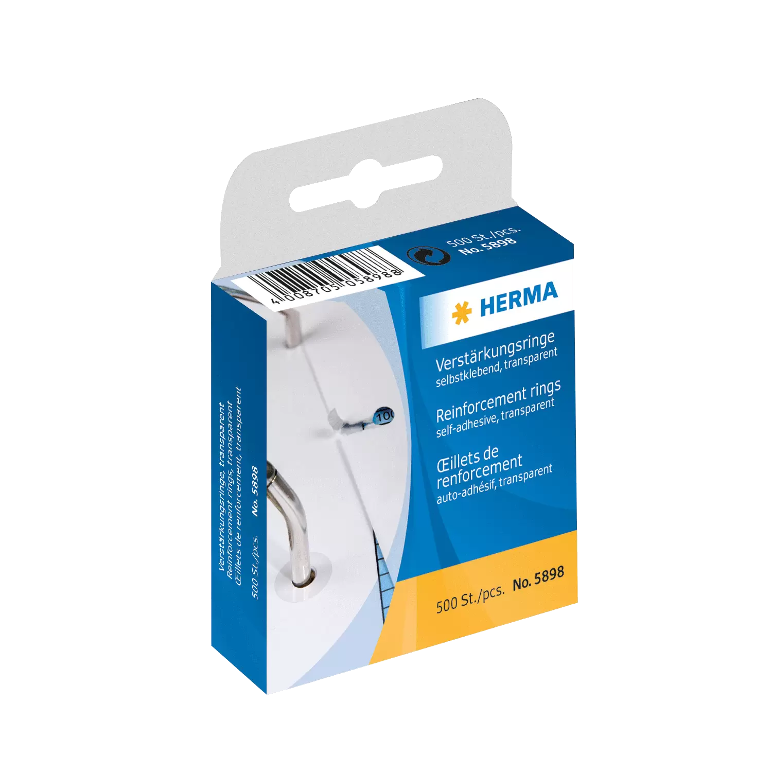 Anelli autoadesivi per rinforzo, in film di plastica antistrappo, per riparare le perforazioni strappate. Diametro esterno 12 mm. Nel pratico dispenser cartonato.