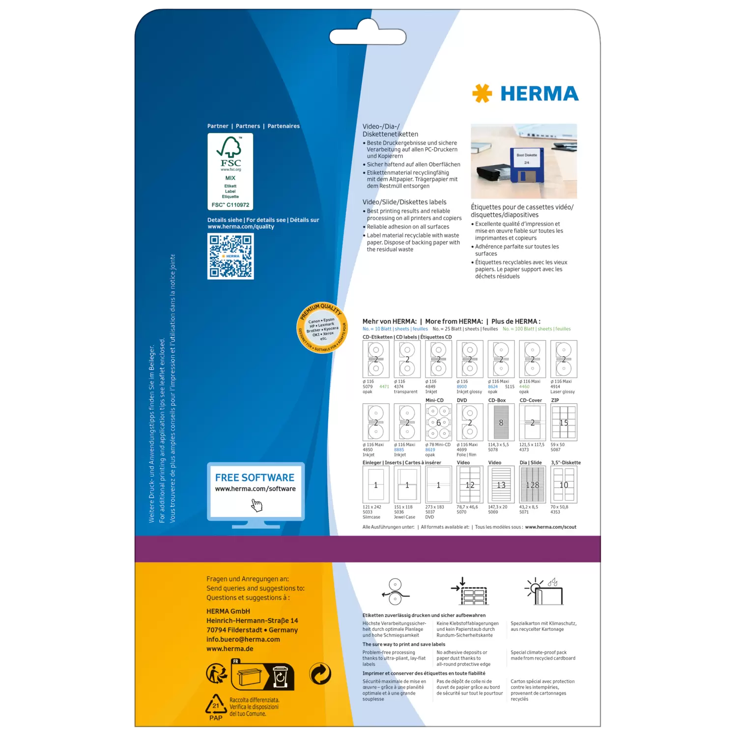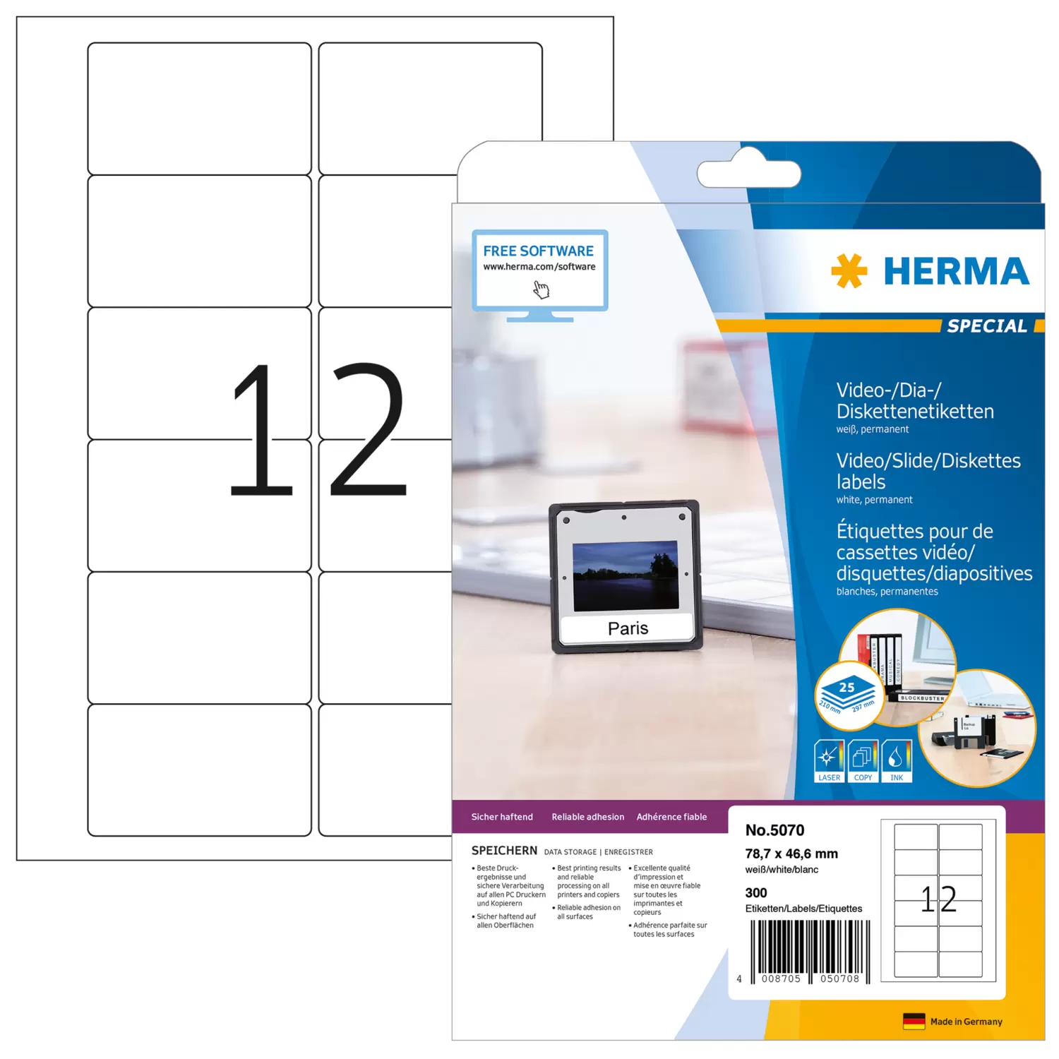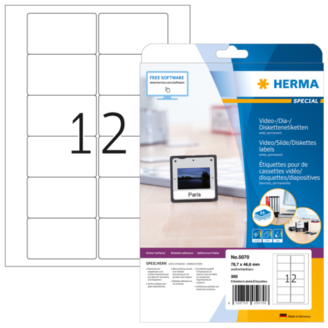 Etichette per videocassette VHS, su fogli A4, autoadesive. Ordine e chiarezza nell'archivio video: ideali per etichettare le videocassette VHS (fronte o retro). Ecologiche: pregiata carta speciale sbiancata senza cloro, certificazione FSC® Mix Credit, adesivo privo di solventi. Ottimi risultati di stampa su tutte le stampanti inkjet e laser, le fotocopiatrici, le stampanti laser a colori e le fotocopiatrici a colori. Elaborazione perfetta grazie al bordo di sicurezza su tutta la superficie e alla planarità ottimale. Soluzioni software gratuite: www.herma.com/software.