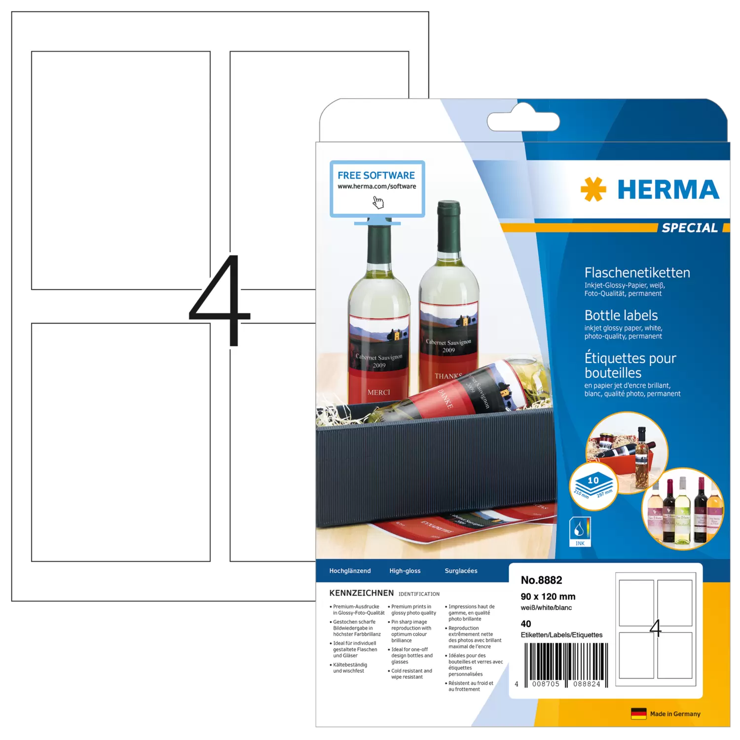 Etichette per bottiglie, Inkjet, A4, 90 x 120 mm, in carta lucida, bianco, adesivo permanente