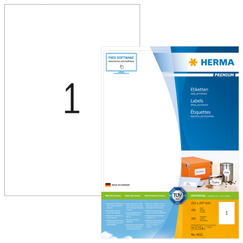 Etichette PREMIUM, A4, 210 x 297 mm, bianco, adesivo permanente