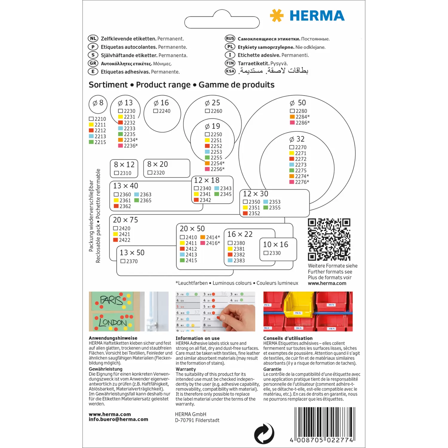 Etichette sigillanti in film di poliestere trasparente con adesivo extra forte. Di impiego versatile come chiusura originaria di confezioni. Fortissimo potere adesivo, anche su superfici critiche o umide. Impermeabili, resistenti all'invecchiamento e ai raggi UV, antiolio e antisporco, lavabili. Ideali per la scrittura a mano, ad es. con pennarelli per lucidi, penne a sfera o matite. Non adatte all'etichettatura tramite PC. Allo scopo utilizzare le etichette sigillanti HERMA su fogli A4.